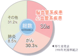 日本の3大死因は「がん」「脳血管疾患」「心疾患」です。なかでも脳血管疾患と心疾患は、いずれも血管の壁が 厚くなって弾力性が失われ、血管が劣化したり狭くなってしまう「動脈硬化」が原因です。