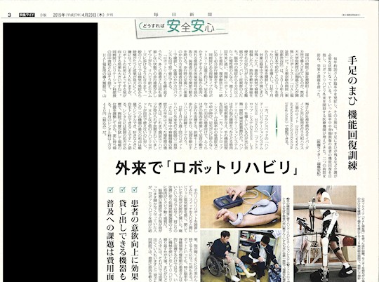 2015年4月23日付の毎日新聞夕刊「どうすれば安全安心」の特集記事の中で、当院のロボットリハビリ外来が紹介されました。