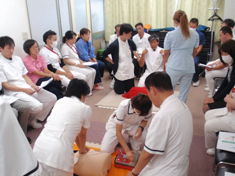 10月27日に院内防災訓練を実施し、各部署のスタッフがAEDによる救命処置や担架での搬送の手順を学びました。