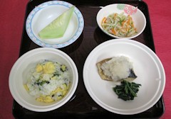 菜の花と炒り玉子で、色どりも春らしいご飯です。