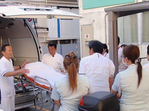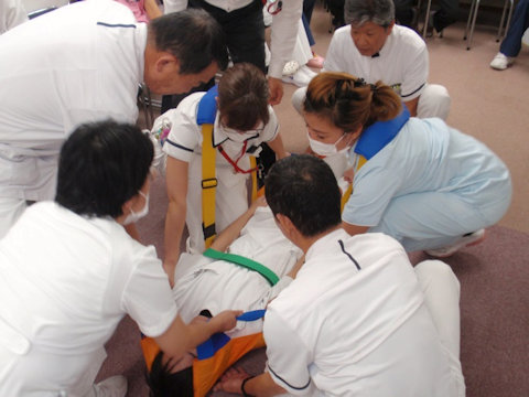 10月27日に院内防災訓練を実施し、各部署のスタッフがAEDによる救命処置や担架での搬送の手順を学びました。